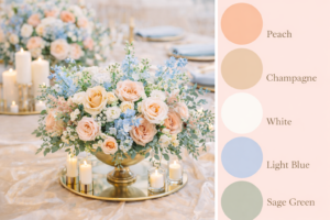 Our personal wedding theme is inspired by a soft, romantic palette that mirrors the natural surroundings rather than competing with them. Floral elements will center around warm peach tones, champagne hues, gentle whites, and subtle blush accents, complemented by touches of light blue and airy greenery. Garden roses, seasonal blooms, and flowing arrangements will create an atmosphere that feels organic, elegant, and quietly joyful. Gold details, soft candlelight, mirrors, and champagne-toned linens will add warmth and reflection, enhancing the natural light and the surrounding landscape without overpowering it. The overall intention is a refined, nature-forward celebration that feels timeless, welcoming, and deeply connected to the setting.